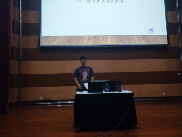 其次,优秀党员代表李闯闯上台发言,李闯闯从自身的入党经历出发,向同学们分享了自己从递交入党申请书到成为一名中共党员过程中,入党动机的改变,并鼓励同学们积极入党,早日成为一名优秀的中共党员。