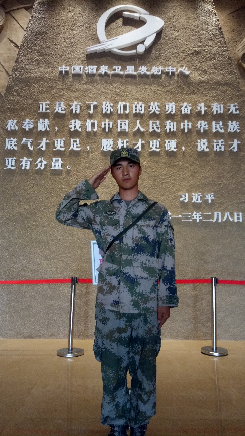 刘昭辉在酒泉卫星发射中心《习近平主席题词》下留念